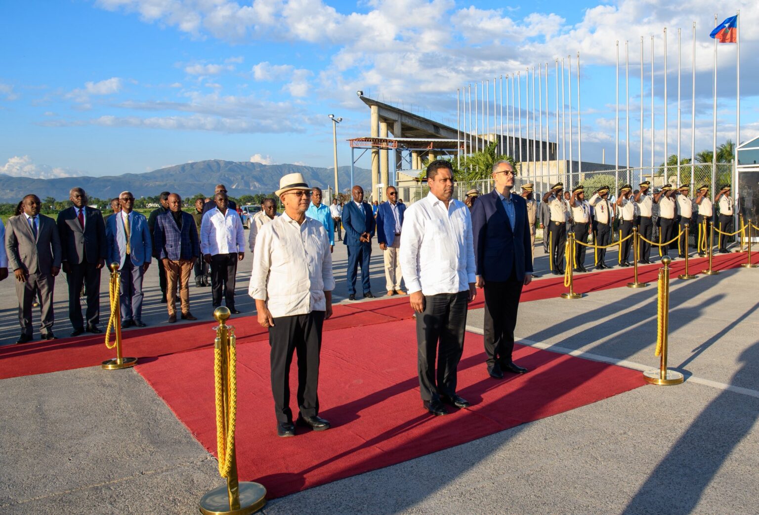 Une délégation composée du Conseiller-Président Leslie Voltaire, du Premier Ministre Alix Didier Fils-Aimé, ainsi que de plusieurs autres membres du gouvernement, du haut état-major des Forces Armées d’Haïti et du haut commandement de la Police Nationale, l’a accueilli sur le tarmac de l’aéroport international Toussaint Louverture.